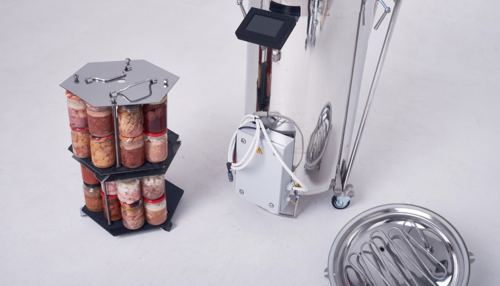 Электрический автоклав из нержавеющей стали с полностью автоматизированным процессом стерилизации. Оснащен электрическим блоком управления (ЭБУ) с возможностью стерилизации в 4 автоматических режимах "Мясо", "Птица", "Рыба", "Компот". В автоклаве предусмотрены автоматические режимы для жестяных банок и реторт-пакетов. Есть возможность сохранения до 10 собственных программ стерилизации для каждого вида упаковки.